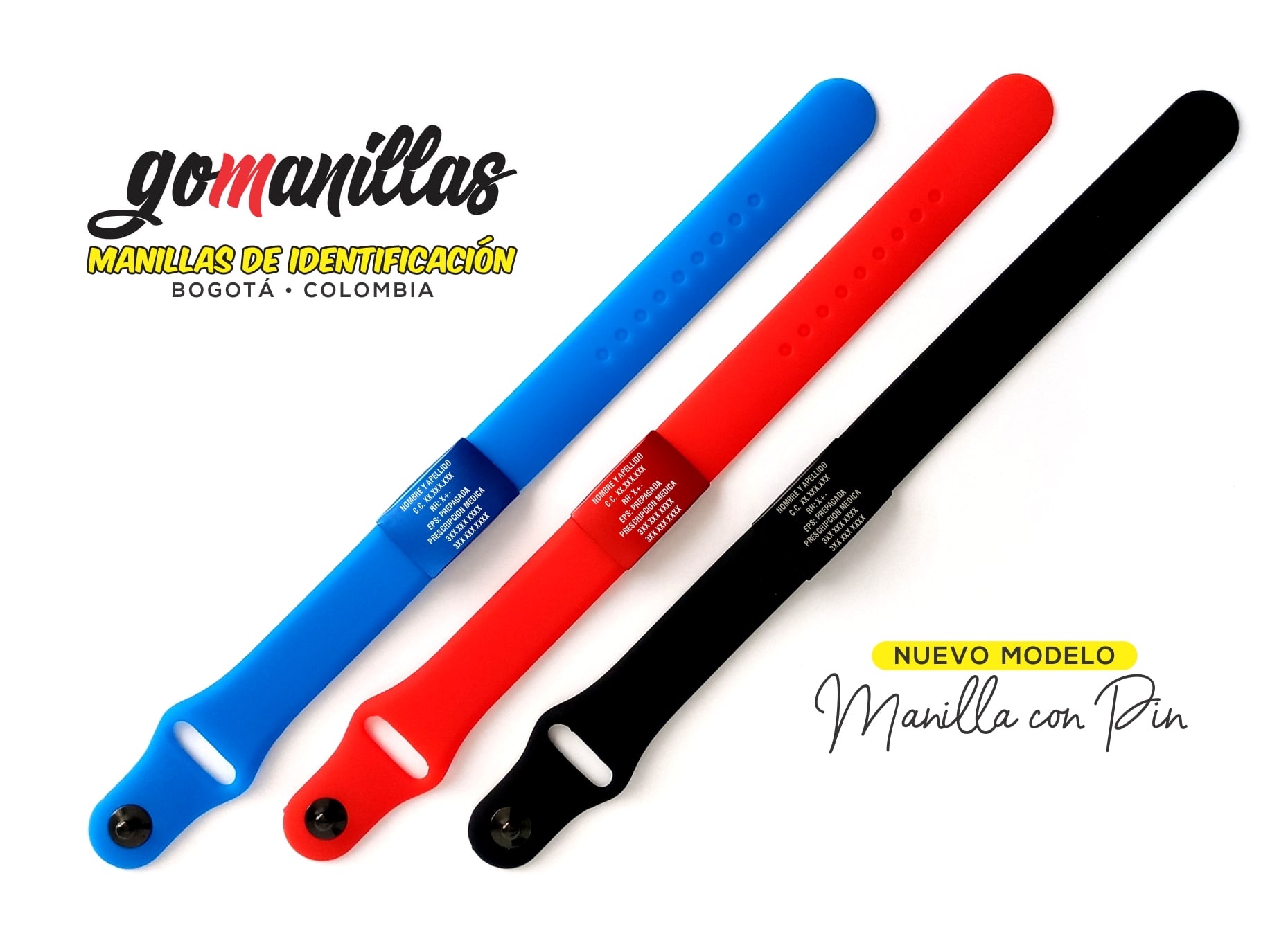 Manilla en silicona hipoalergénica con placa en acero inoxidable.